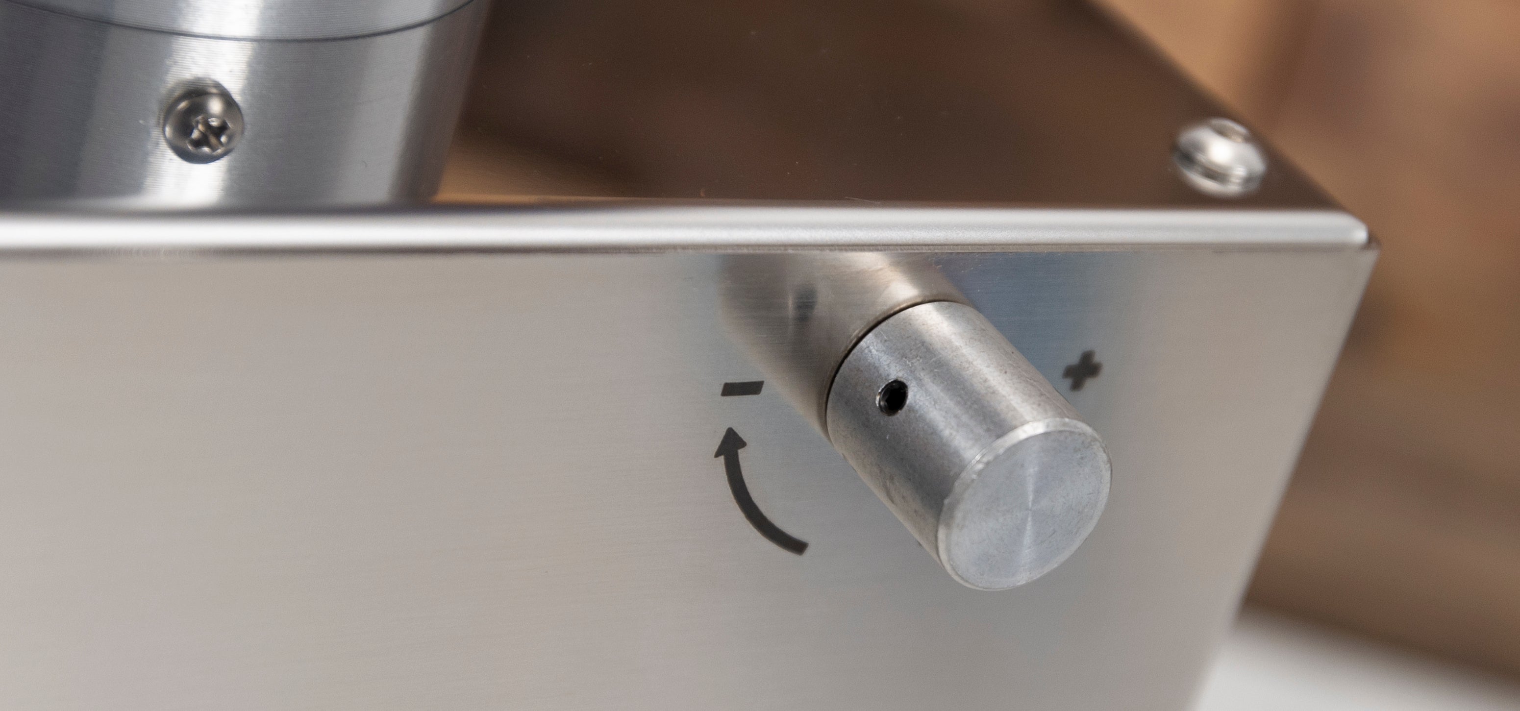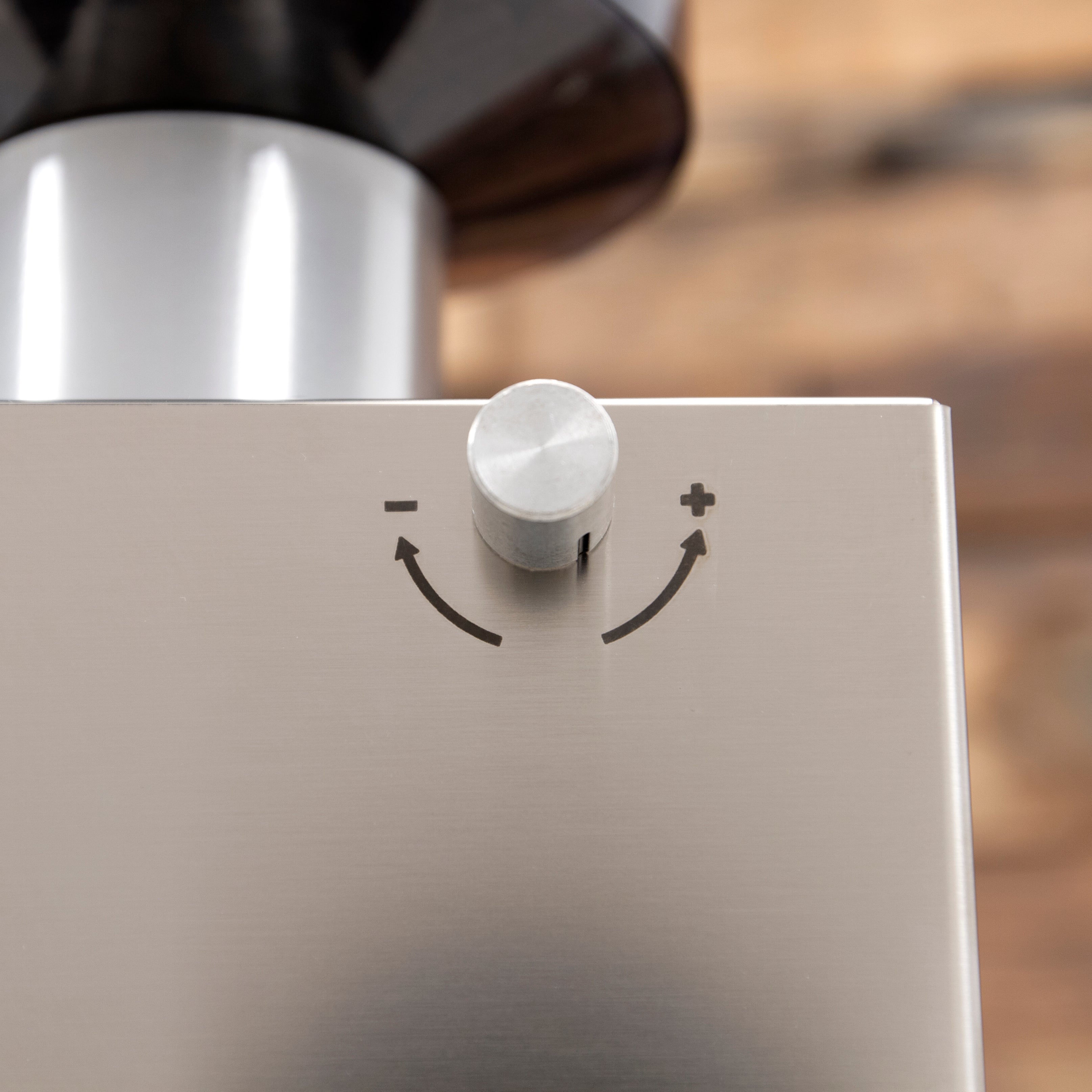 The BB005 makes use of stepless adjustments, conveniently located on the right side of the machine for easy access. The grinder can be set indefinitely until the setting is as fine or coarse as needed. Micrometric design allows for incredibly small changes to be made, meaning the BB005 can be adjusted with an extremely high degree of precision. The built-in timer allows you to dose the amount of coffee needed according to customizable duration that can be set by you. To utilize this feature, hit the button located under the outlet chute when you place your portafilter.