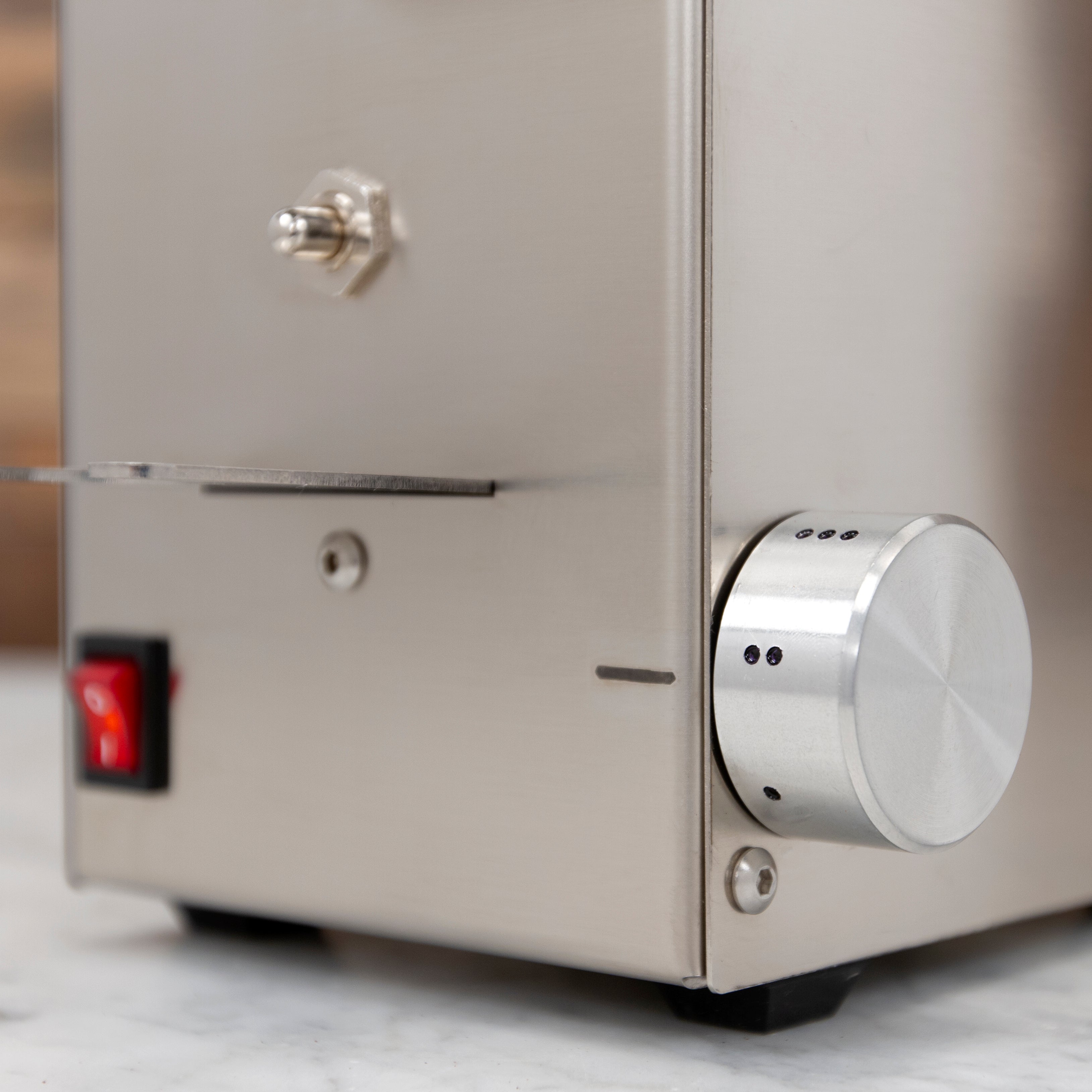 One of the most noticeable features of the BB005 TM is the blue-tinted hopper. Located on top of the machine, it is designed to hold 250 g of beans, which is a common selling size for most coffee roasters. The blue-tint isn’t just for show, either, the color best reduces damage from internal refracted light to preserve the quality of your beans.