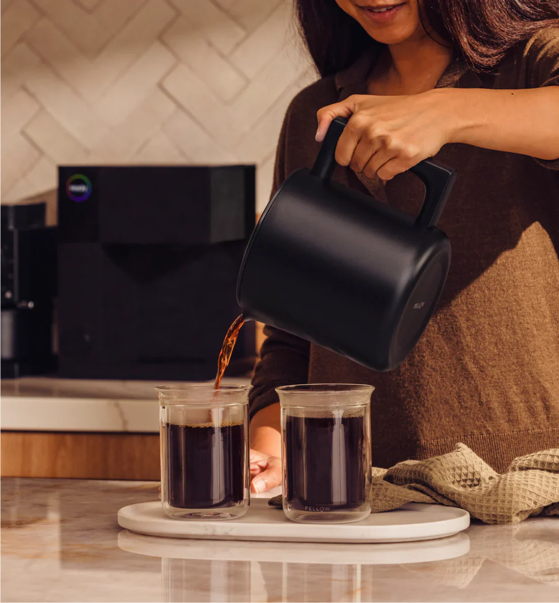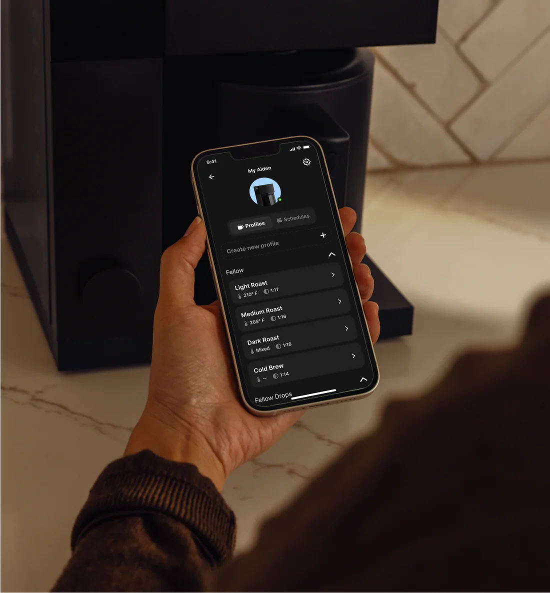 By selecting one of the pre-programmed brew profiles crafted by Fellow’s in-house coffee experts, the Aiden automatically adjusts water temperature, coffee-to-water ratio, and bloom time to brew optimally for whatever type of coffee you’re using. For those interested in doing so, adjusting specific variables is easy, and you can save as many custom profiles as you like. You can use the intuitive one-button controls on the Aiden itself to adjust these settings, or connect to Fellow’s app, which also allows you to schedule and initiate brewing remotely.