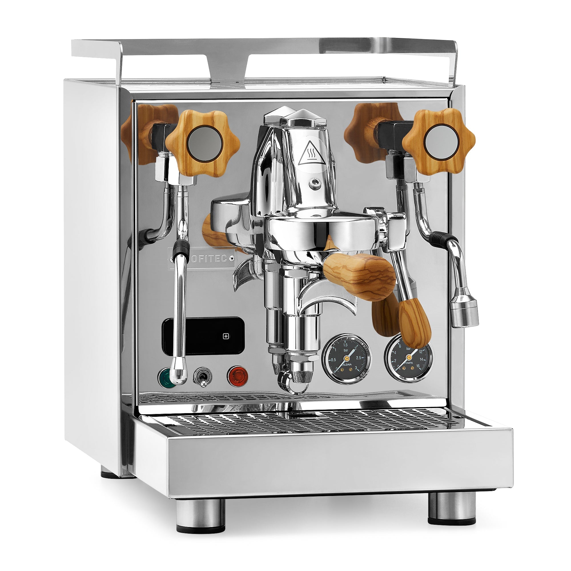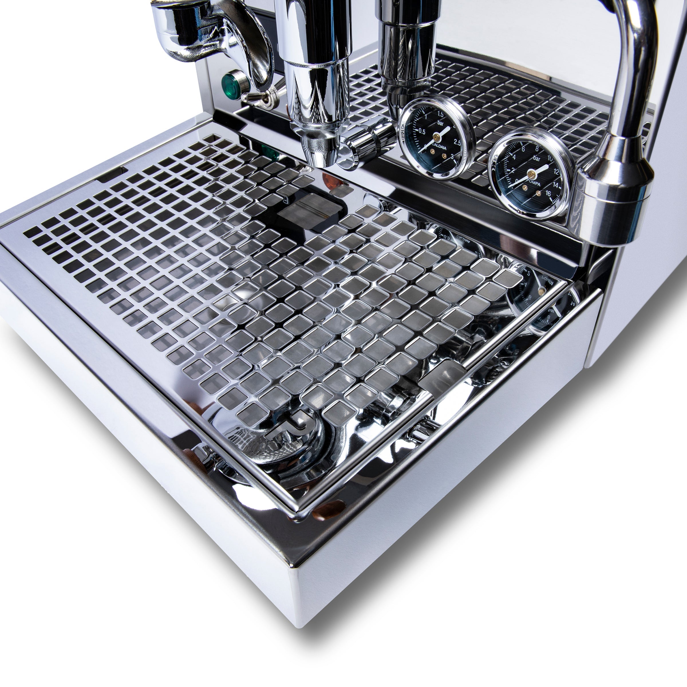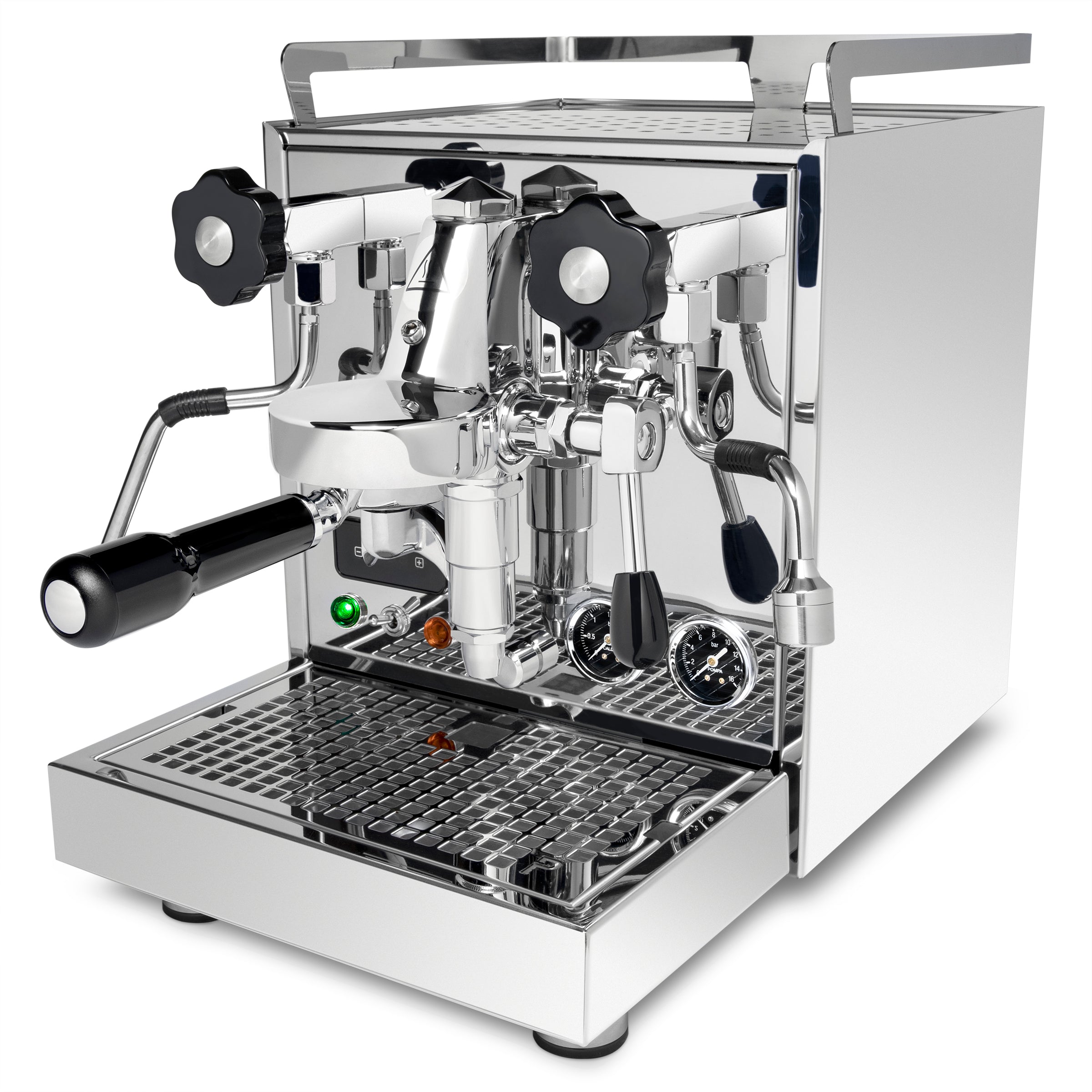 In combination with the engineered thermosyphon system in the E61 group, the Pro 500 PID lends a level of temperature stability previously unheard of in a heat exchanger espresso machine. The need for cooling flushes is eliminated, removing a considerable limitation from this class of espresso machine. When set to a temperature of 256° Fahrenheit, pressure stabilizes for near indefinite steaming while eliminating the necessity of a cooling flush under most circumstances.