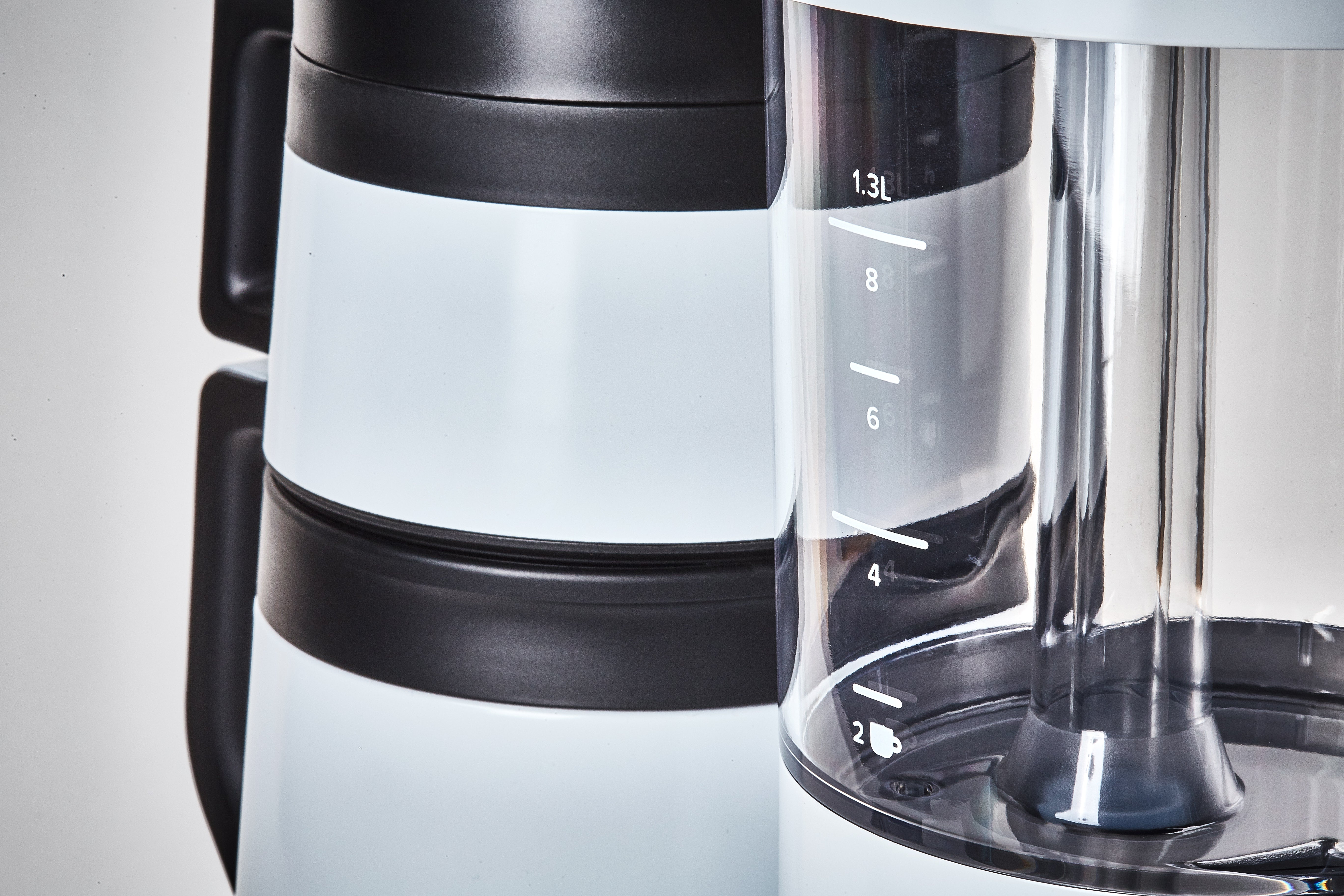A BPA-free copolymer etched water tank holds up to eight cups of water. The included carafe features double-wall stainless steel with a pouring spout that is push activated. Once brewed with, about 10% of the water volume will be absorbed into your coffee grounds. In other words, at the final mark, 44 ounces of water will make roughly 40 ounces of coffee. Throughout the entire brewing process, the water flow is precisely metered.